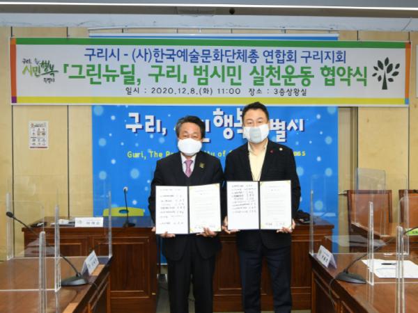 구리시는 12월 8일 오전 11시에 시청 3층 상황실에서 ㈔한국예술문화단체 총연합회 구리지회와의 '그린뉴딜, 구리' 협약식을 가졌다.