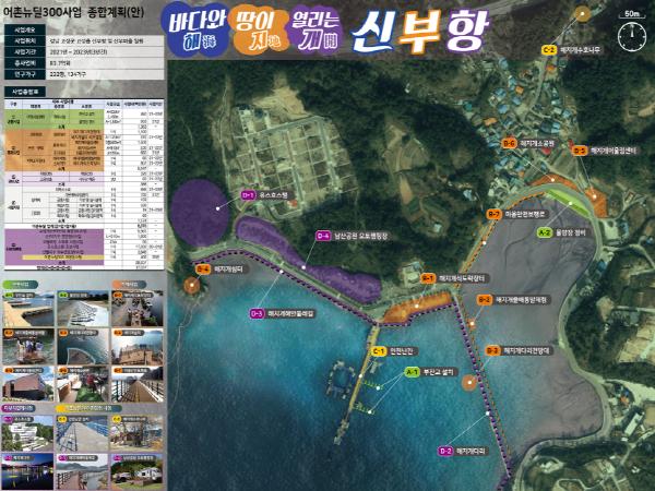 어촌뉴딜 300사업은 해양수산부가 전략적으로 추진하는 사업으로 가기 쉽고, 찾고 싶고, 활력 넘치는 ‘혁신어촌’구현을 위해 낙후된 선착장 등 어촌의 필수기반시설을 현대화하고 지역의 특성을 반영한 특화개발을 추진하여, 지역경제에 활력을 불어넣는 국책사업이다.
