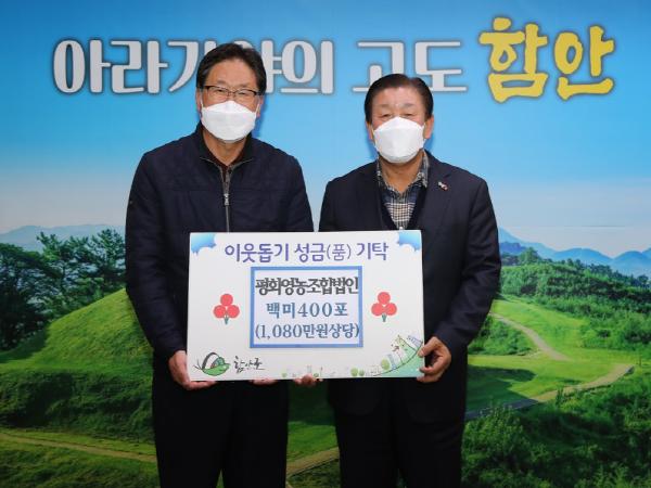 함안 대산면 소재 평화영농조합법인(대표 이성봉)은 지난8일 오후2시, 군청을 방문하여 관내 취약계층을 위해 사용해달라며 백미 10㎏ 400포(1080만 원 상당)를 기탁했다.