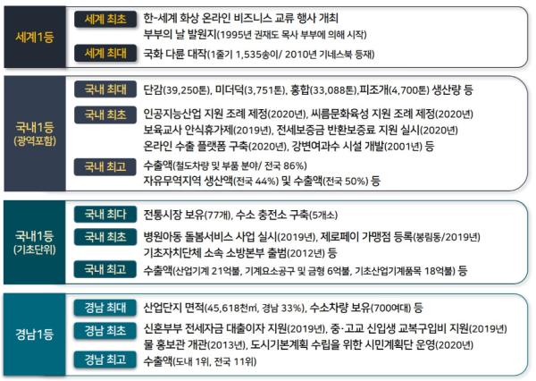 이번에 발굴된 것들에는 단감, 미더덕, 홍합, 피조개(국내 최대 생산량)와 국화(국내 최초 상업 재배, 국내 최대 재배면적) 등의 농수산물 뿐만 아니라 온라인 수출 교역 플랫폼인 큐피트 센터(국내 최초 구축), 스마트 선도산단 지정(국내 최초), 인공지능 산업 육성 지원 조례 제정(국내 최초), 수소 충전소(국내 기초자치단체 중 최다 개소 보유), 경남 최대 수소차량 보유(700여대) 등의 미래산업 관련 항목도 다수 확인됐다.