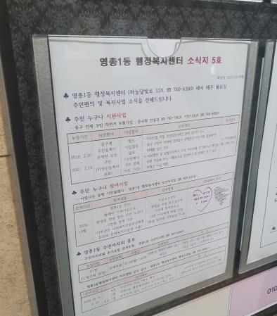 최혜연 영종1동장은 “행정복지센터에 비치되어 있는 수많은 리플릿을 주민들이 하나하나 확인하기는 어렵다고 생각한다. 매일같이 드나드는 아파트 입구, 승강기 입구에 부착하여 주민들이 손쉽게 볼 수 있도록 기획하였다. 꾸준한 발간을 통하여 주민 분들에게 많은 정보제공을 하도록 하겠다”고 말했다.