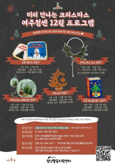 여주 청년활동지원센터에서는 코로나19로 힘든 여주 청년들의 지친 마음에 선물 같은 12월 크리스마스 프로그램의 접수를 12월 2일부터 12월 4일까지 진행했다고 밝혔다.