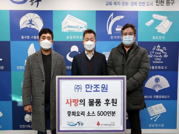 인천광역시 동구는 식품 제조업체 만조원(주)으로부터 결식위기에 있는 저소득가구를 위한 중화요리 소스 500인분을 기탁받았다고 9일 밝혔다.