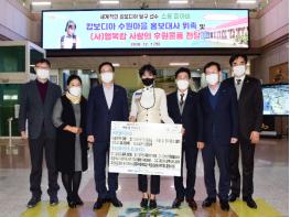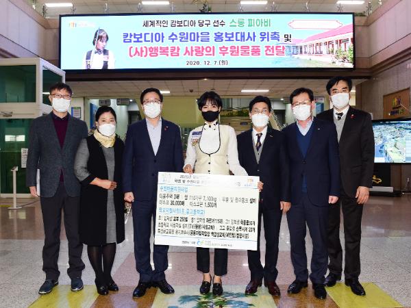 후원 물품 전달식은 지난 7일 오후 수원시청 로비에서 염태영 수원시장과 홍순목 ㈔행복캄 이사장, 수원마을 홍보대사로 위촉된 스롱 피아비 등 최소 인원이 참석한 가운데 방역수칙을 준수하며 간소히 진행됐다.