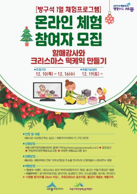 세종특별자치시가 시민들의 ‘집콕생활’을 지원하기 위해 비대면 체험프로그램으로 ‘크리스마스 떡케이크 만들기’ 행사를 진행하고 오는 10일부터 16일까지 참여자를 모집한다.