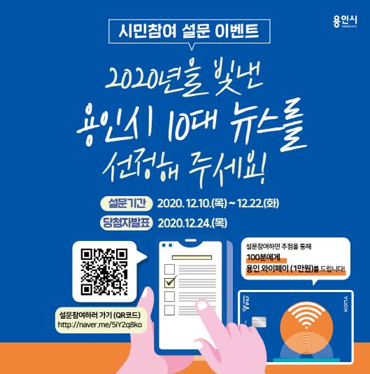 용인시는 10일부터 올해 시와 관련된 정책이나 이슈 가운데 시민들이 가장 공감하고 화제가 됐던 10대 뉴스를 선정하기 위해 온라인 설문조사를 진행한다고 밝혔다.
