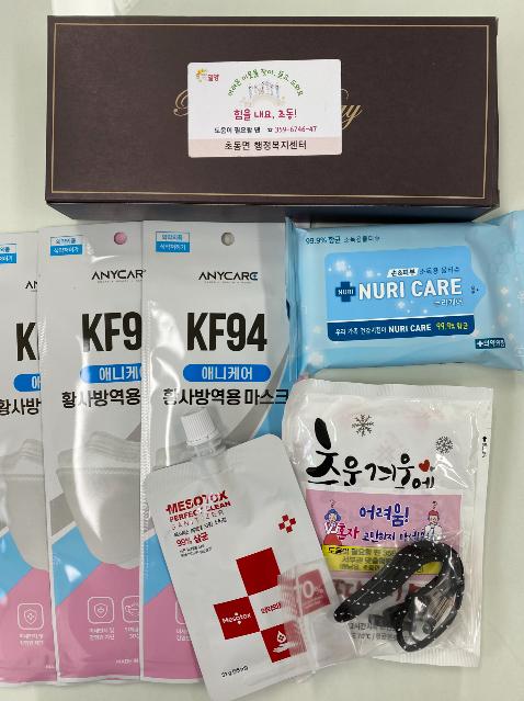 「힘을내요, 초동!」꾸러미는 마스크, 손소독제, 손세정티슈, 마스크줄, 핫팩 등 5가지 방역용품으로 구성됐다.