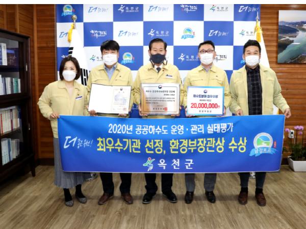 옥천군은 환경부 주관 ‘2020년도 공공하수도 운영·관리 실태평가’에서 최우수 기관으로 선정되어 인증패와 포상금 2천만원을 받았다.