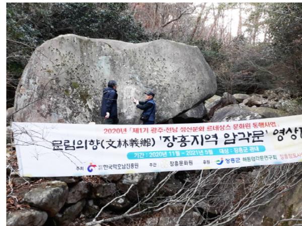 이번 조사는 (재)한국학호남진흥원에서 실시하는 2020년도 ‘제1기 광주?전남 정신문화 르네상스 문화원 동행사업’에서 ‘문림의향(文林義鄕) 장흥지역 암각문 영상제작’과 ‘장흥의 암각문을 따라 걸으며 옛 선비들을 만나다’ 사업이 선정되면서 시작됐다. 지난 11월 12일부터 29일까지 4차에 걸쳐 현장조사를 마친 장흥암각문 조사단은 장흥읍, 관산읍, 대덕읍, 부산면, 용산면 관내의 암각문을 대상으로 실측, 탁본, 동영상 촬영을 추진했다.