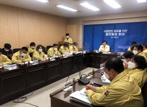 코로나19 확산 상황과 산불예방활동, AI 방역 등 신속한 현장대응이 필요한 읍면동의 실정을 고려하여 읍면동장은 PC영상회의로 참여했다.