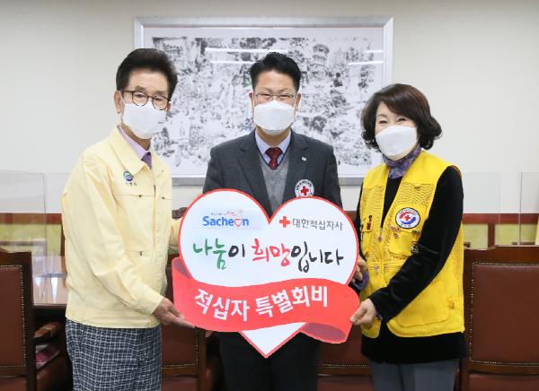 송도근 사천시장은 10일 시청 열린민원실에서 기부문화 확산과 2021년도 적십자회비 모금 독려를 위해 대한적십자사 경남지사에 특별회비 100만원을 전달하였다.
