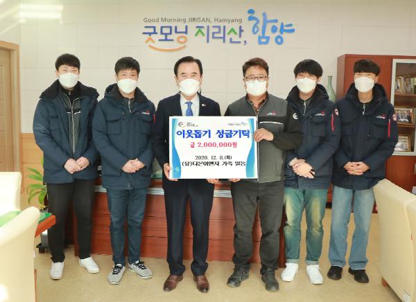 이에 서춘수 함양군수는 “소중한 나눔을 실천해주신 (유)다온이엔지 직원 여러분께 감사드린다”며 “도움이 필요한 우리 이웃들에게 잘 전달하겠다”고 말했다.