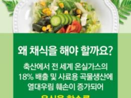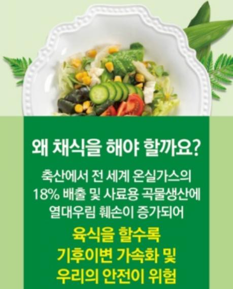 전 세계 온실가스 배출량의 18%가 축산과정에서 배출되어, 이는 전 지구인이 비행기, 자동차 등 모든 교통수단이용으로 발생하는 온실가스 13.5%보다 많은 양으로 1인이 육식대신 2번 채식시 6.5kg의 탄소가 감축되어 소나무 1그루를 식재하는 것과 같은 효과가 있다.
