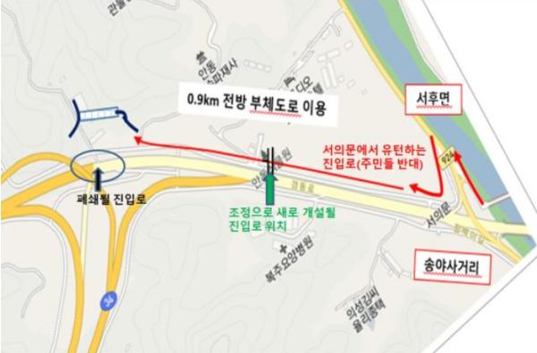 교리운곡마을의 진입도로를 이용했던 마을주민들과 부근의 요양병원 이용객 등은 서의문 방향의 도로를 우회해 교리운곡마을로 진입할 수밖에 없는 상황이 됐다.