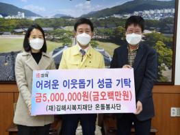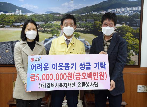 (재)김해시복지재단 온돌봉사단(단장 김은주)에서 지난 10일 김해시를 방문하여 어려운 이웃에게 전달해 달라며 성금 5백만원을 김해시에 기탁하였다.