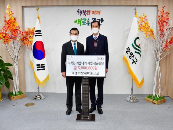 중랑구는 10일 오후 2시 30분 4층 구청장실에서 묵동화랑새마을금고(이사장 장인식)로부터 2021년 희망온돌 따뜻한 겨울나기 성금 500만 원을 전달받았다고 밝혔다.