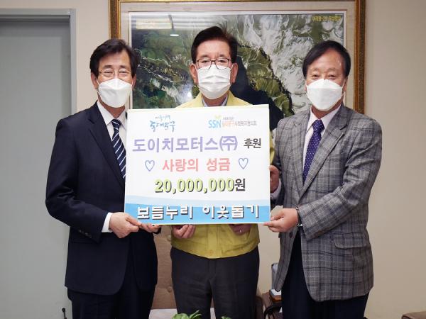 답십리1동에 소재한 도이치모터스㈜(대표 권오수)가 10일 오후 2시 30분 동대문구청에 방문해 보듬누리 이웃돕기 성금 2천만 원을 전달했다.