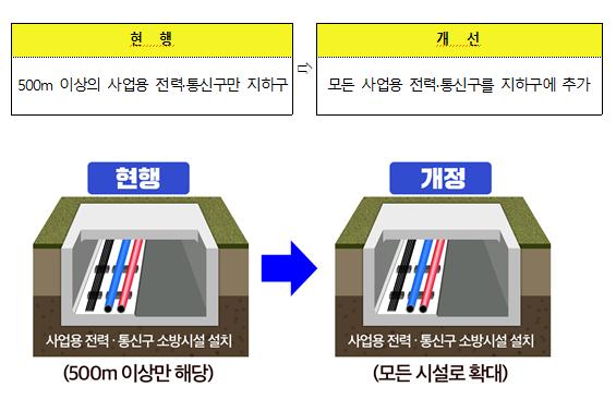 또한 길이가 500m 이상인 전력 또는 통신사업용 지하구*만 소방시설을 설치할 의무를 두었으나 시행령을 개정하여 모든 전력 또는 통신사업용 지하구에는 길이와 관계없이 소방시설을 설치하도록 했다.