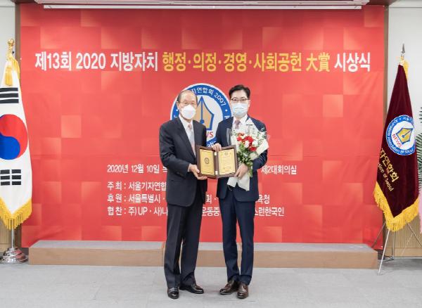 이정훈 강동구청장이 지난 10일, 건전한 정치문화를 앞당기고 사회의 각 분야에서 뛰어난 경쟁력과 도덕성이 검증된 인물을 발굴하기 위한 ‘제13회 2020 지방자치 행정·의정·경영·사회공헌 대상’에서 행정 부문 대상을 수상했다.