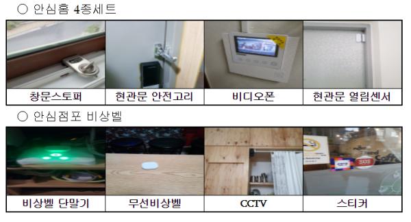 여성1인 가구 안심홈세트는 현관문 안전고리, 창문 잠금장치, 비디오폰, 문열림센서 등으로 구성되어 있으며, 여성1인 점포 비상벨세트는 비상벨, 무선비상벨, CCTV, 등으로 구성되어 있다.