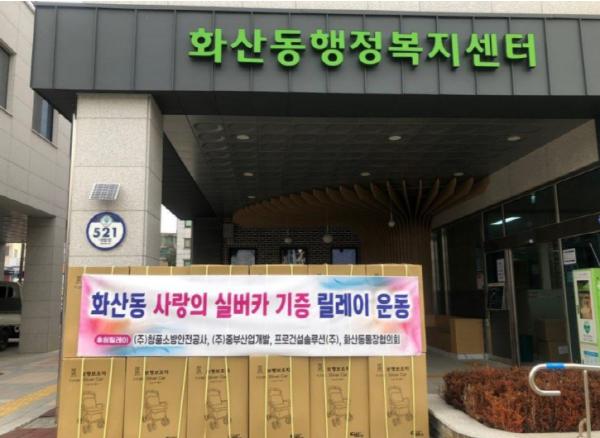 프로건설솔루션(주) 100만원, 화산동통장협의회(회장 최완진)가 100만원을 쾌척하며 총 40대를 후원하여 화산동 사랑의 실버카 기증 릴레이 운동에 동참하였다.