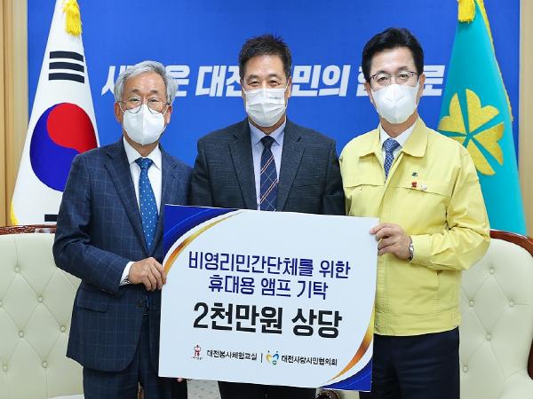 이날 시청 응접실에서 진행된 기탁식에는 허태정 대전시장과 권흥주 대전봉사체험교실 회장이 참석했다.