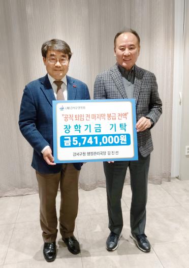 서울 강서구(구청장 노현송) 김진선 행정관리국장은 오는 12월 말 명예퇴직을 앞두고 마지막으로 받는 430번째 봉급 전액인 574만 1천 원을 강서구장학회에 전액 기부한다고 밝혔다.