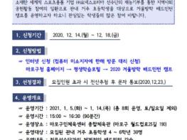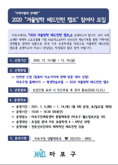 마포구는 2021년 1월 5일부터 14일까지 8회에 걸쳐 운영되는 '2020 겨울방학 배드민턴 캠프'의 참여자를 모집한다고 밝혔다.