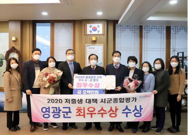 영광군은 저출생 극복을 위해 지역여건에 맞는 촘촘하고 빈틈없는 결혼·임신·출산·양육지원 강화와 출산 친화환경 조성으로 군민의 삶의 질 향상을 위해 결혼장려금 지원, 임신부 교통카드 지원, 난임부부 시술비 본인부담금확대 지원, 산모신생아 건강관리비 본인부담금 90% 지원, 신생아 양육비 500만 원에서 최대 3,500만 원까지 지원, 출산축하용품 지원, 분만산부인과 운영비 지원 등 맞춤형 정책 추진으로 2019년 출생아수가 578명으로 159명 증가하여 영광군 합계출산율(2.54명) 전국 1위, 난임부부 시술비 지원을 받은 산모의 출생아수가 19명이 증가하는 등 아이 낳고 키우기 좋은 인프라 확충에 노력한 점에서 우수한 평가를 받았다.
