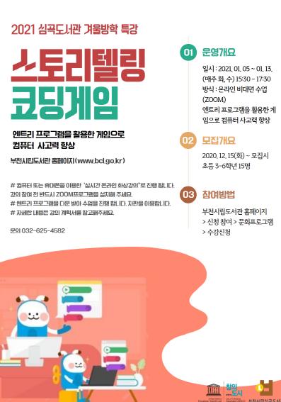 부천시 심곡도서관에서는 겨울방학을 맞이하여 어린이가 창의력과 상상력을 발휘할 수 있는 다양한 문화프로그램을 운영한다.