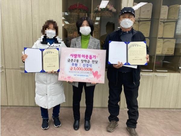 이번 장학금 전달은 평소 지역아동센터와 소외계층아동을 위해 후원활동을 펼치고 있는 신경식 작가가 어려움을 겪고 있는 금촌2동 지역 청소년들에게 전달해 달라며 장학금을 기부해 진행됐다. 신경식 작가는 공동모금회를 통해 소외계층 다자녀 3가정에 장학금으로 각 1백만 원씩 기부했다.