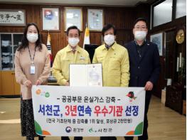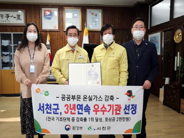서천군이 환경부 2020년 공공부문 온실가스 에너지 목표관리제 우수기관 선정에서 3년 연속 온실가스 감축 우수기관으로 선정돼 환경부 장관상을 받았다.