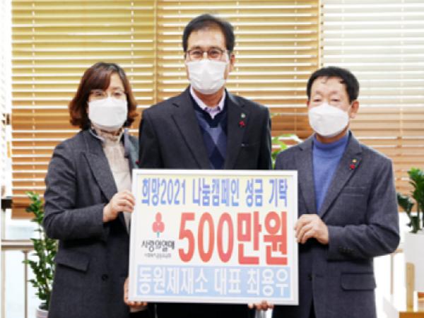 10일에는 유한회사 보리곰(대표 천재영)에서 1천만 원, 동원제재소(대표 최용우)에서 5백만 원, 수풀나라(대표 박준호)에서 3백만 원을 각각 희망 나눔 캠페인에 지정 기탁했다.