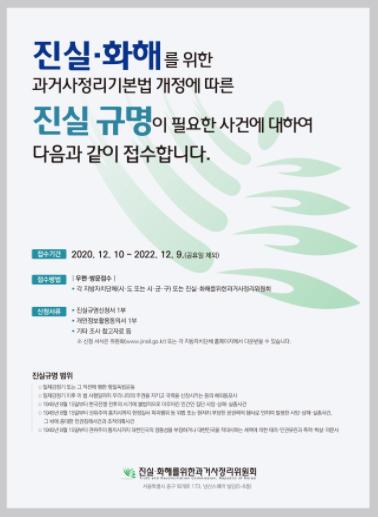 진실규명 신청 기간은 2020년 12월 10일부터 2022년 12월 9일까지 2년간이고, 주소지 상관없이 누구나 신청서를 작성하여 인근 지자체나 서울에 소재하고 있는 진실화해위원회에 직접 방문 제출하거나 우편 등을 이용하여 제출할 수 있다.