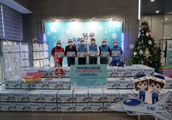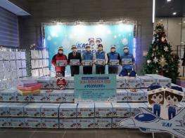 “KAI 파란산타가 간다”의 사회공헌 활동으로 실시한 이번 행사는 관내 저소득 가정의 겨울나기 나눔 키트 400개, 소화기 및 화재감지기 400개, 한부모가정 아동희망 크리스마스 선물 306개, 저소득 가정 크리스마스케이크 335개 총 9,000만원 상당의 물품을 지원하였다.