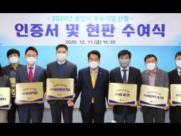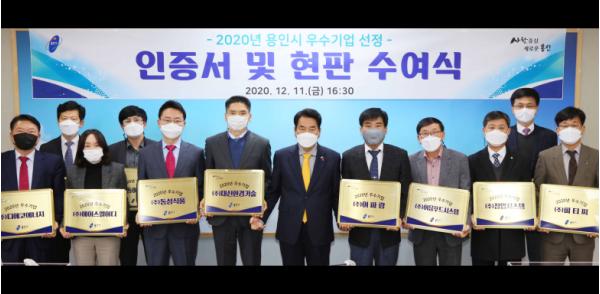 용인시는 11일 올해 지역 경제 발전에 앞장서 온 11개 중소기업을 ‘2020년 용인시 우수기업’으로 선정해 인증서와 현판을 전달했다고 밝혔다.