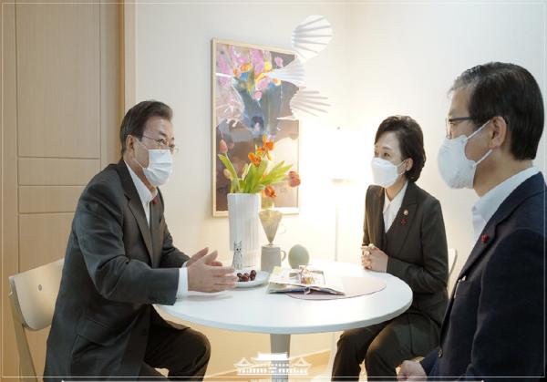 이후 단지 내 어린이집으로 이동한 대통령은 입주민들과 함께 '집과 사람들의 이야기'라는 주제로 '살고 싶은 임대주택 보고회'를 이어갔다.