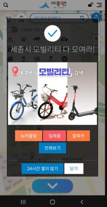 개인 이동수단 이용을 위해서는 세종엔에 표출된 정보를 활용, 이동수단을 선택한 후 ‘이용하기’를 눌러 해당 앱을 실행한 후 이용하면 된다.