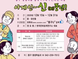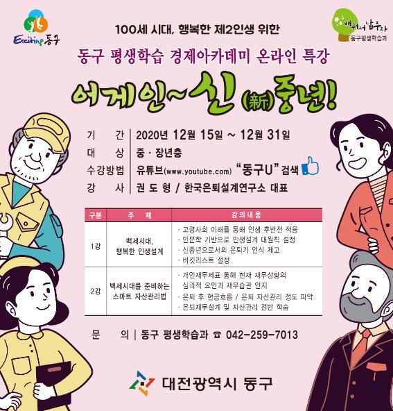 대전 동구는 오는 15일부터 31일까지, 45세에서 65세의 신(新)중년을 대상으로 온라인 경제 특강 ‘어게인~신(新)중년’을 운영한다고 밝혔다.