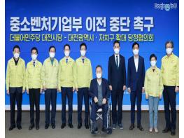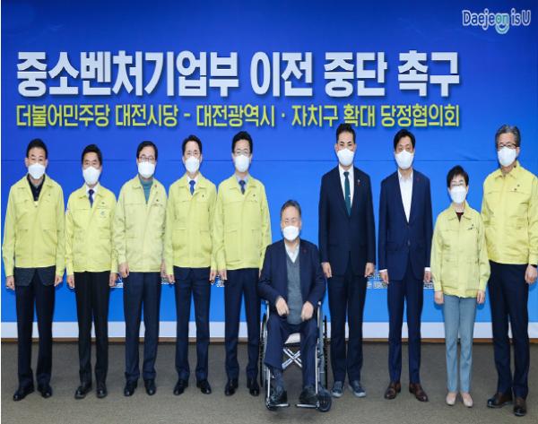 더불어민주당 대전시당과 대전시, 5개 자치구, 시의회는 13일 오전 10시 시청 대회의실에서 긴급 ‘확대 당정협의회’를 열고 공청회 등 중기부의 세종 이전 행정절차를 즉각 중단할 것을 촉구했다.