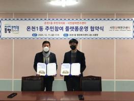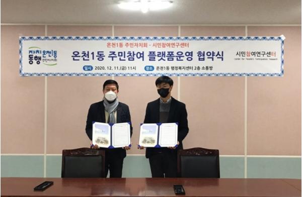 대전 유성구는 지난 11일 온천1동 행정복지센터에서 동 주민자치회(회장 여성룡)가 시민참여연구센터와 주민자치 활성화와 주민 의견수렴 통로 확대를 위해 ‘주민참여플랫폼 운영 협약’을 맺었다고 밝혔다.