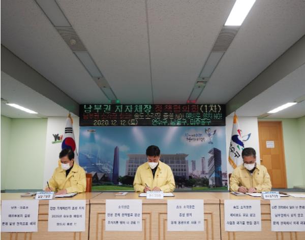 고남석 연수구청장, 이강호 남동구청장, 김정식 미추홀구청장은 12일 오후 3시 연수구청에서 ‘제1차 남부권 자원순환 정책협의회’를 열고 협의회 운영과 남부권 소각장에 대한 입장을 담은 합의사항에 공동 서명했다.