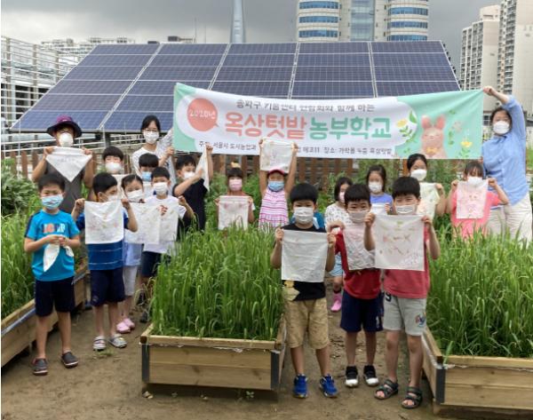 ‘옥상텃밭 농부학교(농부학교)’는 가락1동 송파키움센터에서 진행된 심리방역프로그램이다. 7월부터 10월까지 16회로 진행되었으며, 회당 30여 명의 아동들이 참여해 벼농사, 깨모종 심기, 토피어리 만들기, 손수건 천연염색, 지렁이 만져보기 등의 활동을 체험했다. 서울시 도시농업과와 사회적기업 에코11이 함께 했다.