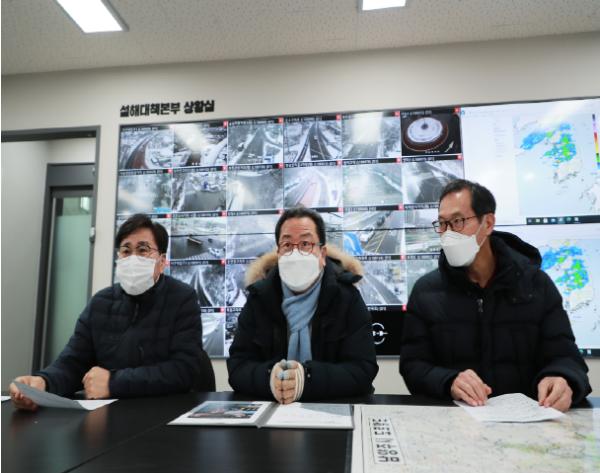 이어서 설해대책본부 상황실로 이동하여 주요도로변 제설작업 현황 및 교통흐름을 볼 수 있는 재해상황시스템을 통해 읍면동별 제설현황을 꼼꼼히 확인했다.