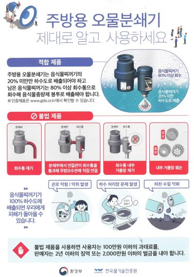 시 관계자는 “불법 주방용 오물분쇄기 판매자는 2년 이하의 징역 또는 2,000만 원 이하의 벌금이 부과되며, 사용자에게도 100만 원 이하의 과태료가 부과되니 피해가 발생하지 않도록 각별히 주의해야 한다.”고 당부했다.