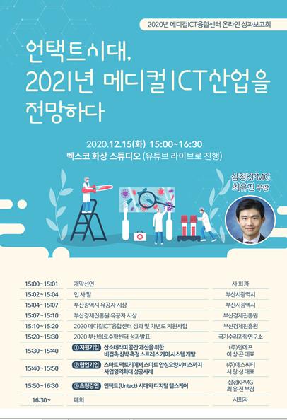 부산시는 부산경제진흥원과 함께 12월 15일 오후 3시부터 「2020년 메디컬ICT융합센터 성과보고회」를 온라인으로 개최한다고 밝혔다.