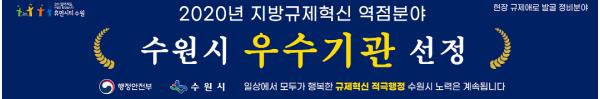 수원시가 행정안전부 주관 ‘2020년 지방규제혁신 역점 분야 우수기관 포상’에서 ‘현장 규제애로 발굴·정비 분야’ 우수기관으로 선정돼 행정안전부장관 표창을 받는다