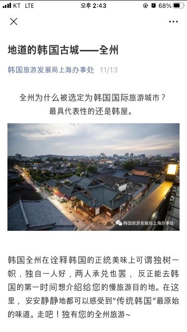 전주를 한국에서 꼭 가봐야 하는 관광지로 알리기 위한 이번 홍보는 한국관광공사 전북지사와 상하이지사 후원을 받아 중국 유력 SNS 채널을 활용해 전개되고 있다.