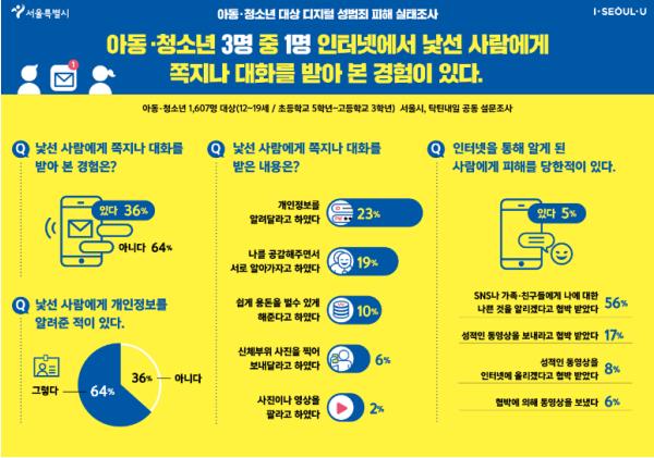 한편, 서울시가 초?중?고교생 1,607명을 대상으로 디지털 성범죄에 대한 첫 피해 실태조사를 실시한 결과, 3명 중 1명(36%)은 메신저나 SNS 등을 통해 낯선 사람에게 쪽지나 대화 요구를 받아본 적이 있는 것으로 나타났다.
