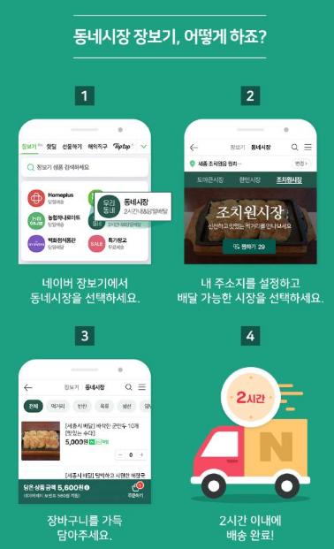 네이버 장보기 서비스는 코로나19로 인해 어려움을 겪고 있는 소상공인의 소득 안정화와 지역 경제 활성화를 지원하기 위해 시와 네이버가 공동으로 추진하는 비대면 주문·배송 서비스다.